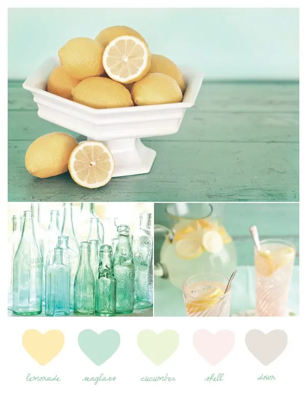 After last week’s color palette took a rich and dramatic turn, I decided to give happy spring-inspired yellow another whirl. This palette is soft and sunny, inspired by lemonade and a pale watery shade of seaglass. Fresh cucumber and pale shell pink provide a decided spring feeling, with a little touch of something neutral to keep it from feeling too much like Easter pastels. What do you think? Are you ready for spring yet? We hit 50 degrees here in Syracuse yesterday – heat wave! Fresh squeezed lemonade here we come.