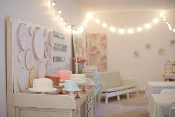 I was so excited to have the lovely Jenny Haas share her niece Ada’s first birthday party. Jenny’s sister pulled together all of the pretty shabby chic details, from the vintage-inspired fabric hoops along the wall to the beautiful cluster of mini cakes. I love the simple white roses tucked in old milk bottles and the strings of white lights criss crossing the room. Everything about this party is so pretty and feminine, it’s the perfect way to say happy birthday to a sweet baby girl.