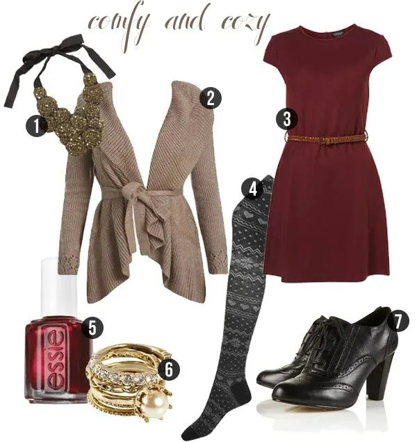 Shop: 1. Chain Rosette Necklace via Couture Candy. / 2. Belted Cover Up from Wet Seal. / 3. Belted T-Shirt Dress from Topshop. / 4. Fair Isle Tights from Forever 21. / 5. Scarlett O’Hara Nail Color from Essie. / 6. Gold Stacking Rings from Debenhams. / 7. Lace-up Brogues from Topshop.
