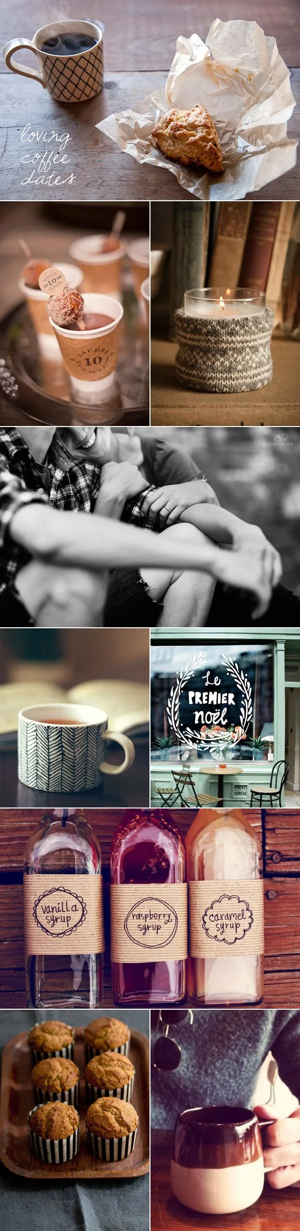 {Photo credits from top, left to right: coffee and scone / coffee with donut stirrers / sweater candle / cuddles / painted mug / café / homemade coffee syrups / coffee cake /coffee mug.}