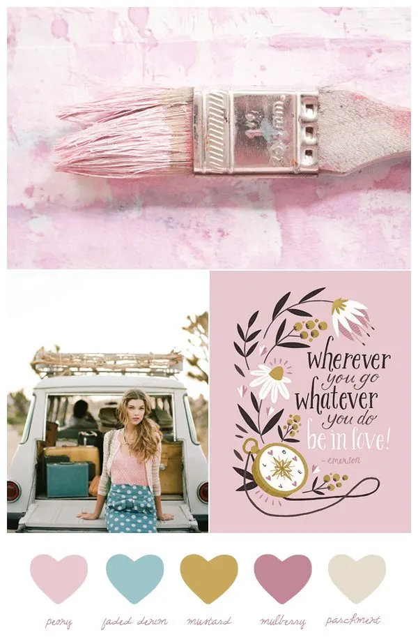 Good morning and happy Monday, friends! I hope everyone had a fabulous weekend. I’m feeling incredibly optimistic and upbeat today and looking forward to an awesome week. To kick things off, a pretty little color palette featuring a washed out vintage-inspired combination of peony pink, faded denim blue and rich mustard yellow. I am totally digging these colors right now, how about you?