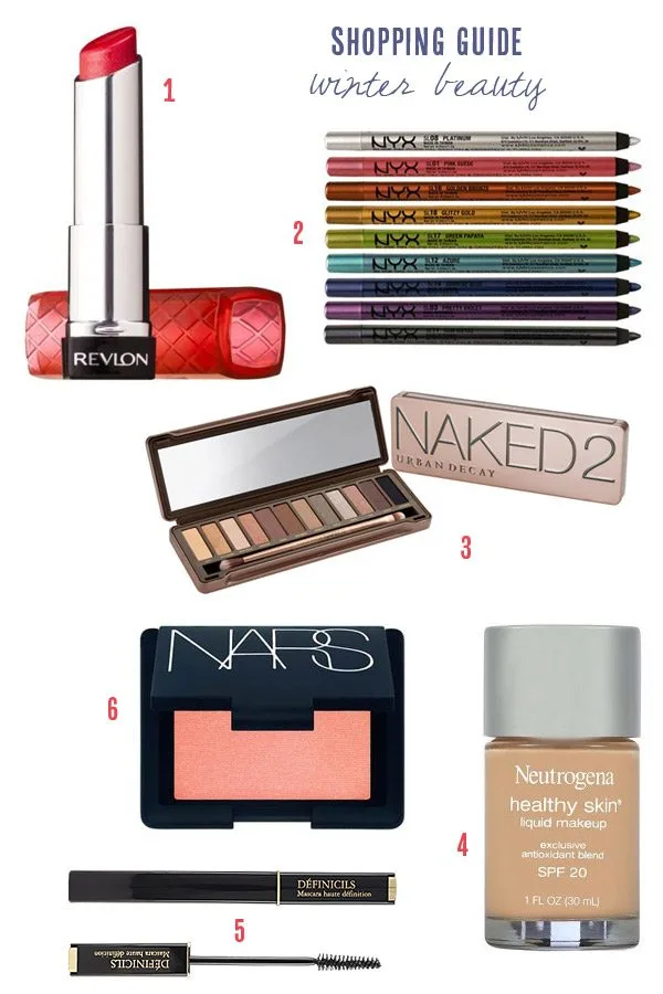 Shop: 1. Revlon ColorBurst Lip Butter in Cherry Tart / 2. NYX Cosmetics Slide On eyeliner pencils / 3. Urban Decay Naked2 eyeshadow palette / 4. Neutrogena Healthy Skin foundation / 5. Lancome Definicils mascara in deep black (this has been my go-to mascara for years) / 6. NARS blush in Orgasm