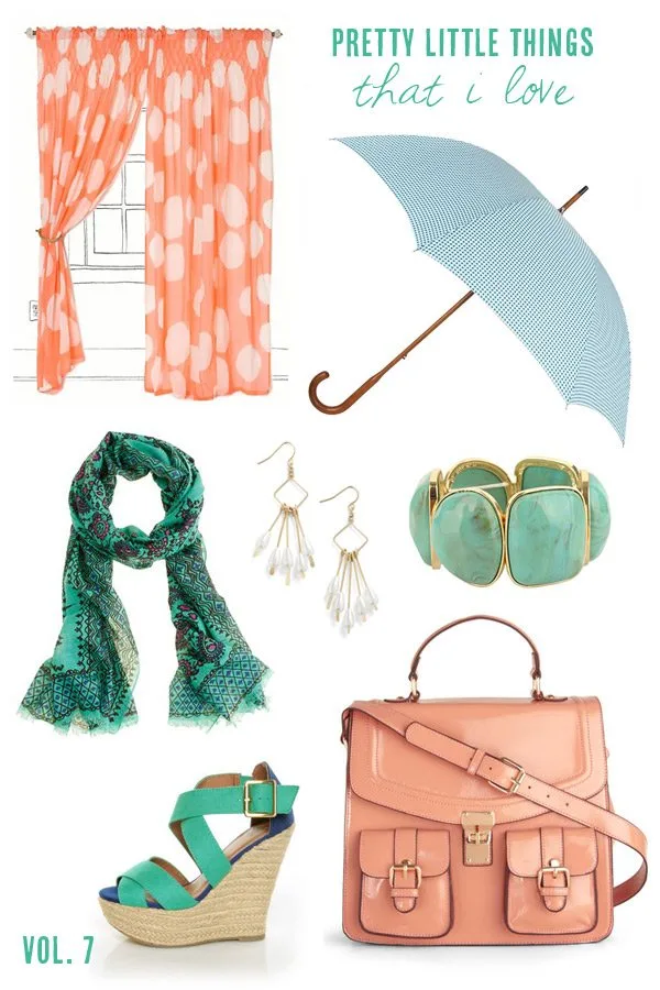 {Shop: Curtains / umbrella (via) / bracelet / earrings / scarf / wedges / handbag.}