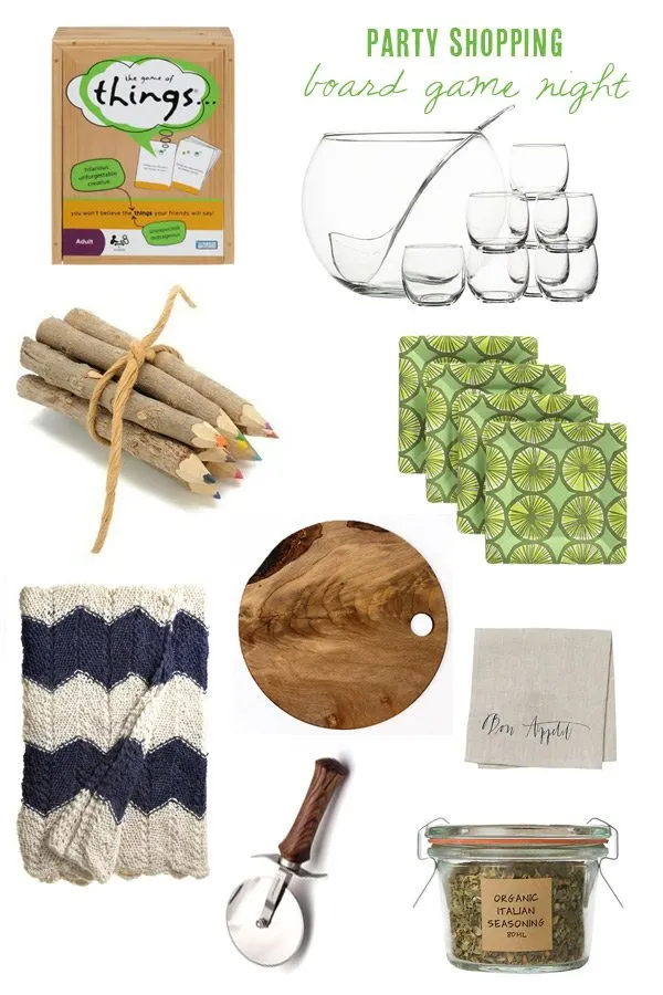 {Shop: The Game of Things / punch bowl / appetizer plates / pizza board / bon appetit napkin / Italian herbs / pizza cutter / throw / pencils.}